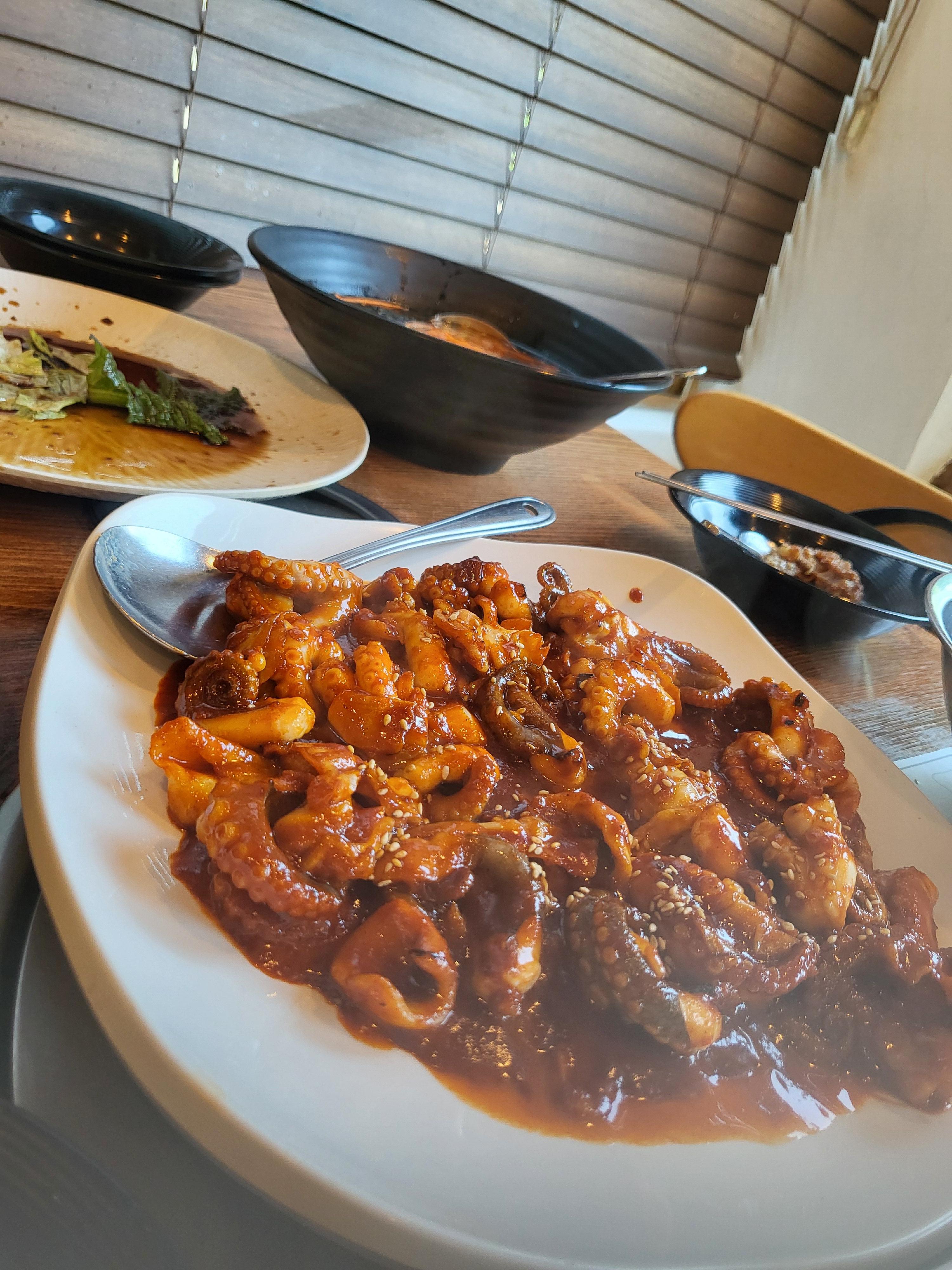 샐러드 국물에 도토리전을 찍어먹는 맛은 일품이다. 두 번째는 역시 주꾸미 요리의 맛이다.